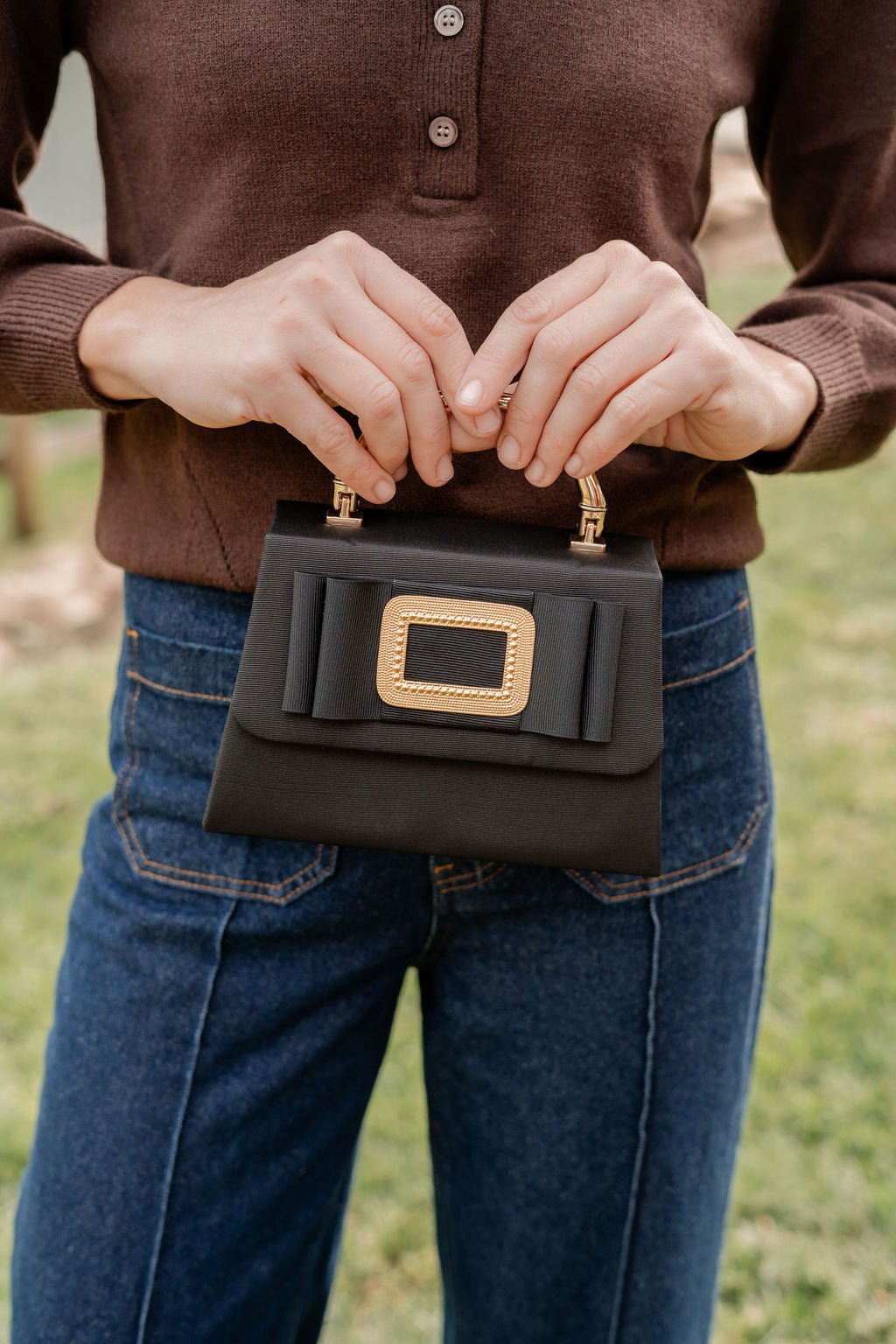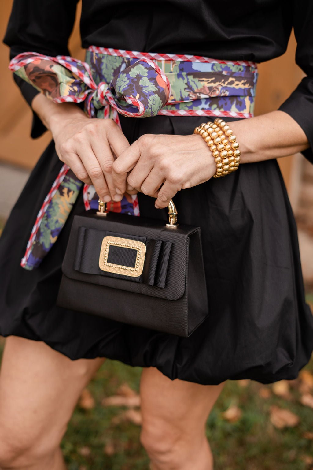 Our small fabric handbag features a gold bamboo-style handle, with just enough room for your phone and a few cosmetics. With this classic black ribbon and gold buckle, you will be the star of any event with a bag that matches your style!
