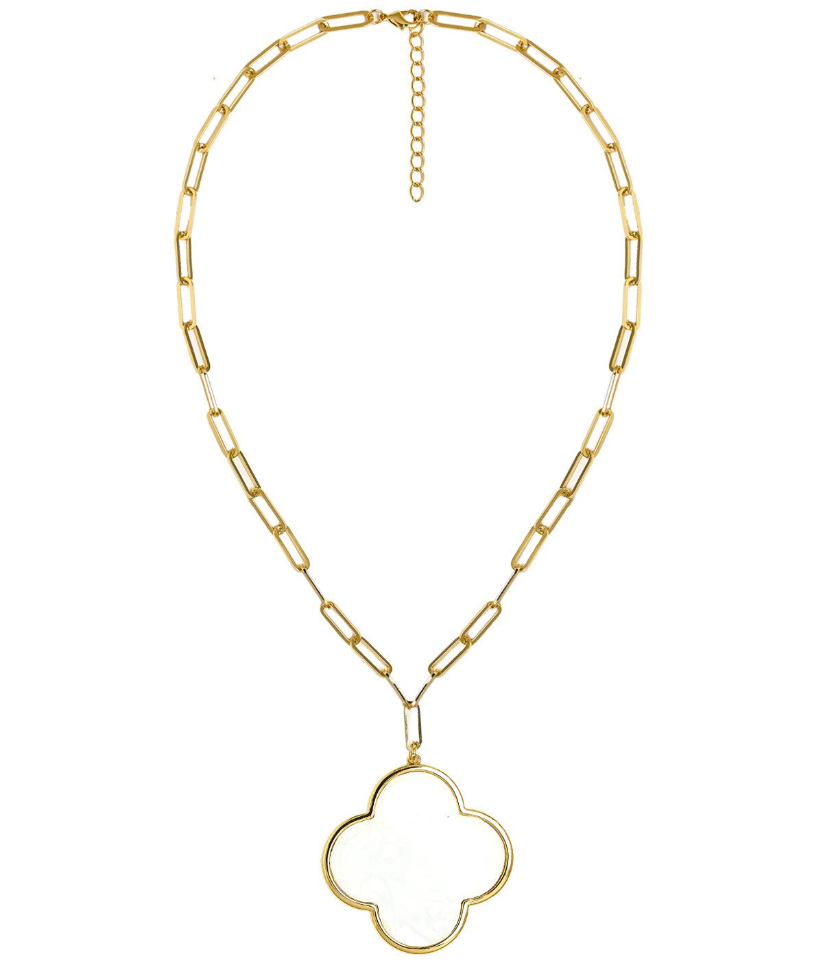 Elevate your everyday style with the Quincy Large Clover Shell Necklace. Featuring a bold clover-shaped pendant crafted from luminous shell and framed in gold, this statement necklace brings timeless elegance with a modern twist. The oversized clover design symbolizes luck and sophistication, while the chic paperclip chain adds a contemporary touch. Perfect for layering or wearing solo, the Quincy Necklace is a versatile piece that transitions seamlessly from day to night.