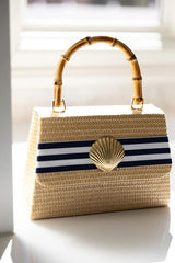 Straw Lulu with Bamboo Handle - Navy & White Band with Scallop Charm