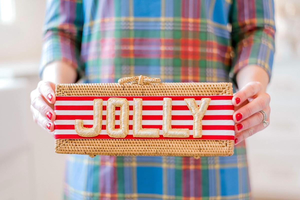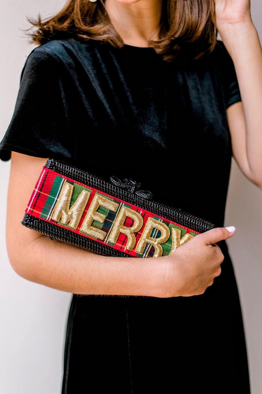 Show off the perfect evening handbag and make an impression. A black woven and satin handbag with brass feet and magnetic closure, Jackie is a petite evening bag that enhances your outfit with ease. This holiday season Jackie pops with a plaid holiday bow and large gold adornment.